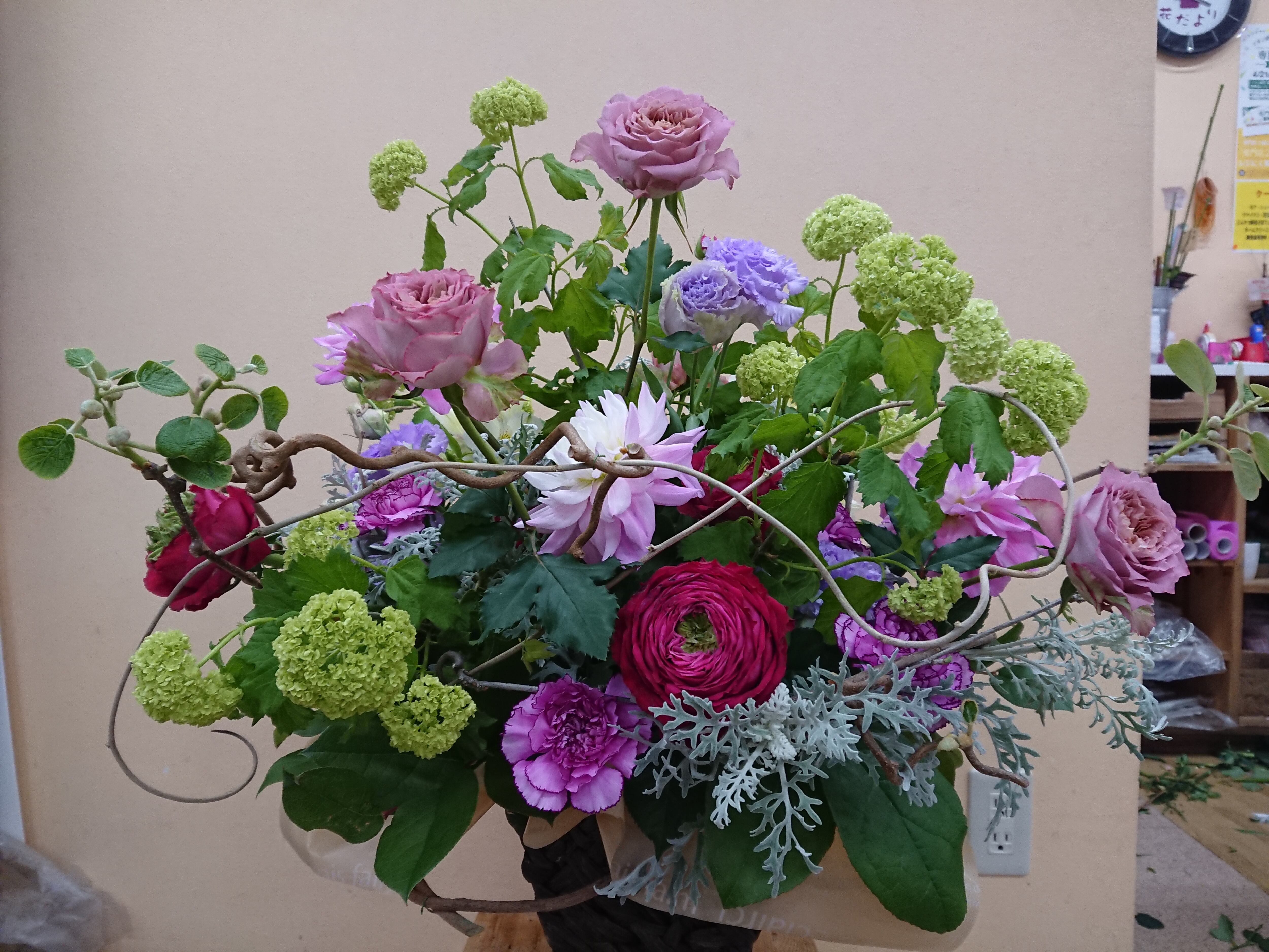 ピンク、紫系で仕上げた華やかなアレンジメント