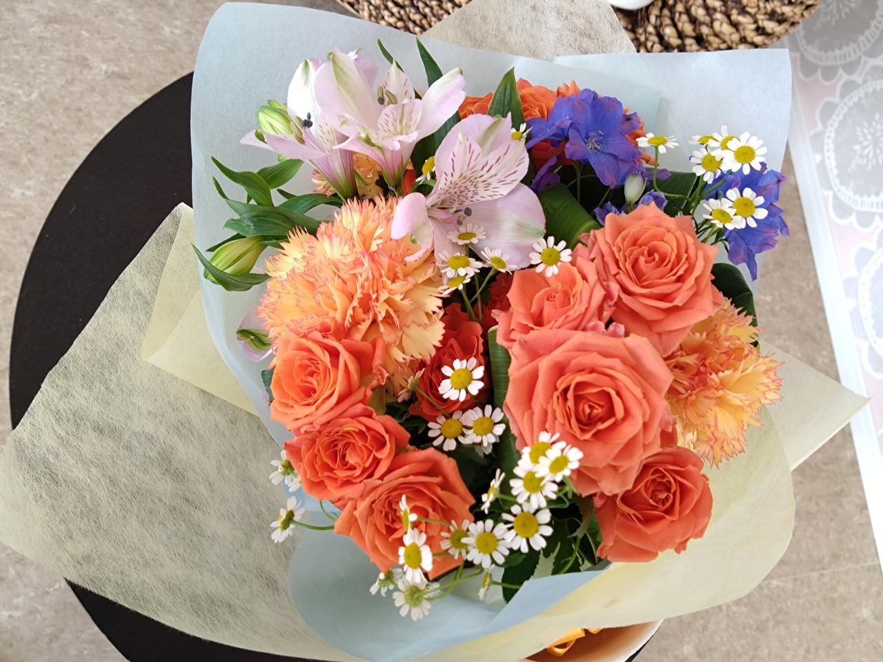 オレンジ・黄色のグラデーションに差し色でブルーまたは、紫系を